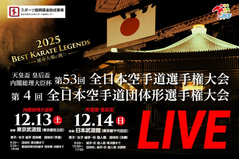 日本一が決まる運命大戦は、全空連YouTube (JKF CHANNEL)でライブ配信され、男女団体形/男女個人形/男女個人組手/決勝戦の模様は、12月14日(日)15:00よりNHK Eテレで放送されました。